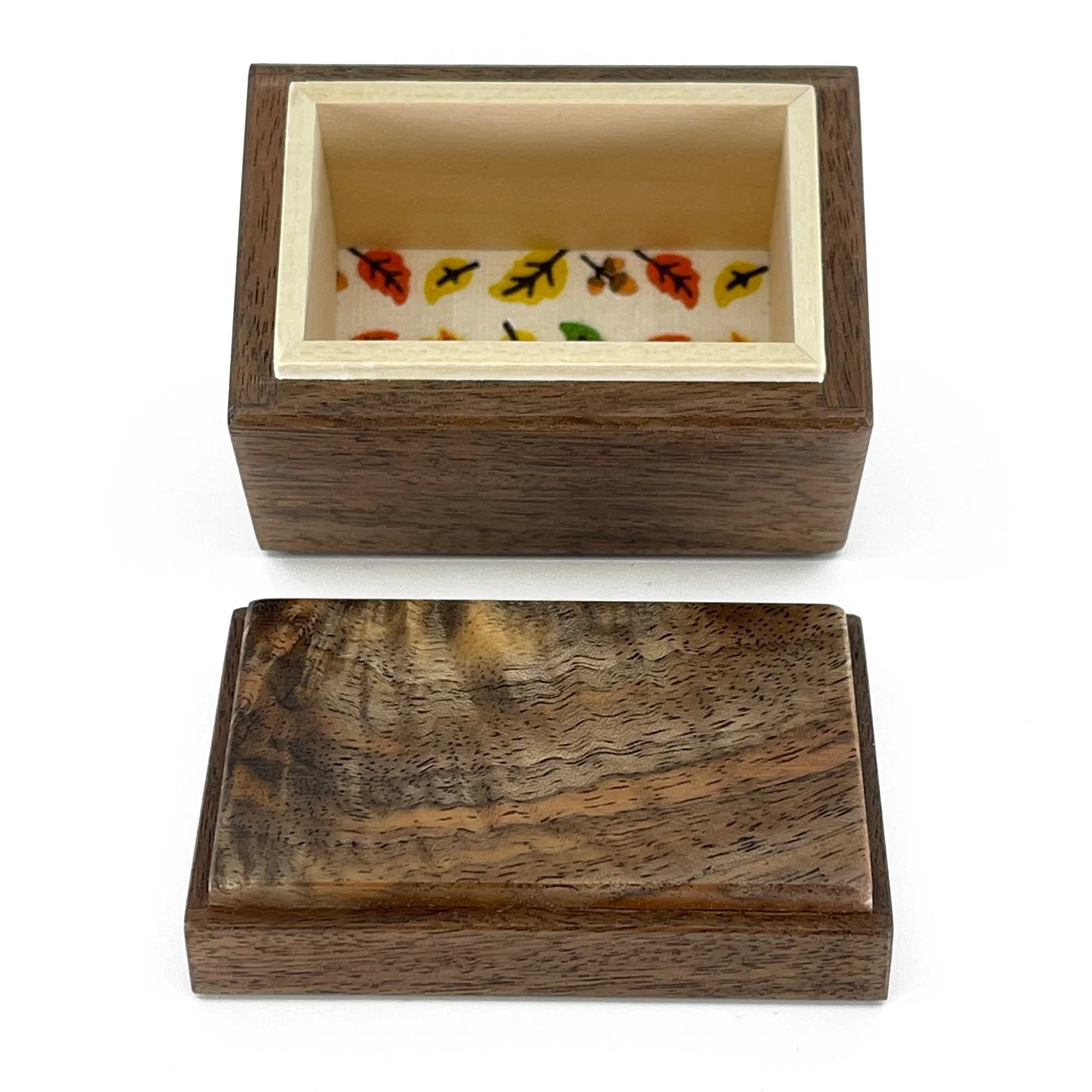 I use fabric on the inside of the top and bottom of the box. I got this idea from Matt Kenney, who’s written books and magazine articles on box building. I design the fabric and have it printed on organic cotton hemp by Art Fabrics. For these little boxes I designed a fall foliage themed fabric, which I think compliments the walnut nicely. The boxes are lined with 3mm thick basswood which brightens the inside of the box and serves as a lip to capture the box top.